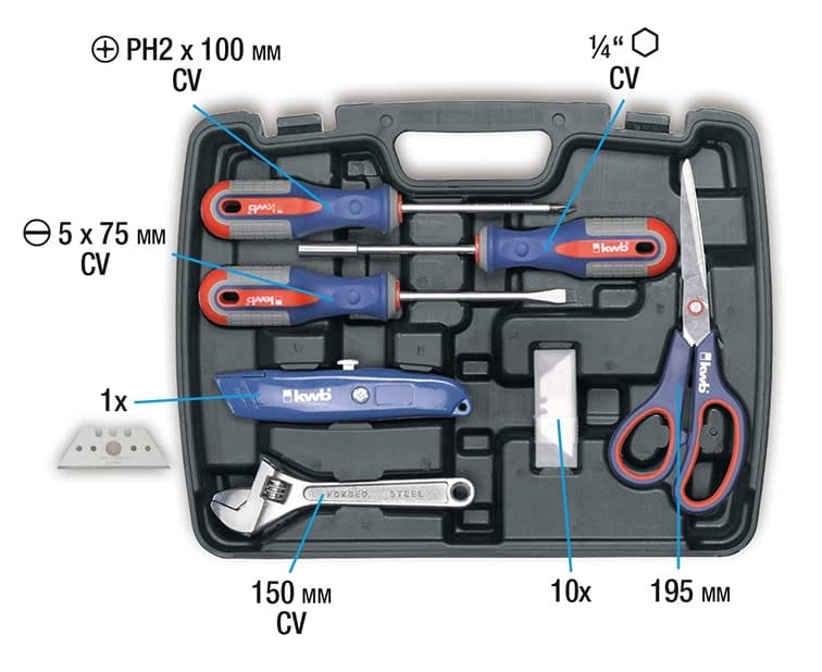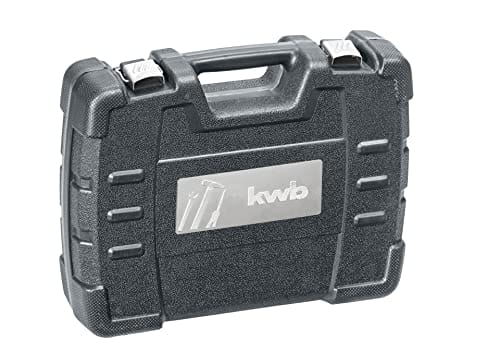 ✅ Wytrzymała walizka z: Wytrzymała walizka z twardego tworzywa sztucznego: w stabilnej skrzynce narzędziowej KWB z twardego tworzywa sztucznego z metalowym logo KWB i ergonomicznym uchwytem do noszenia, który jest odporny na uderzenia z wysokości do 1 m, znajduje się zestaw narzędzi.