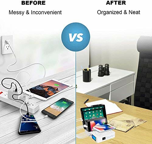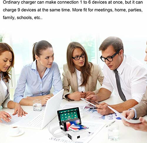 • [Stacja ładująca do wielu urządzeń] Dzięki 8 portom USB i 1 bezprzewodowej poduszce do ładowania QI stacja ładująca może ładować do 9 urządzeń jednocześnie w jednym miejscu. Stacja ładująca jest ponadto dostarczana z 8 krótkimi kablami do ładowania (25 cm, 2 kable z systemem Android, 2 Apple, 4 typu C), dzięki czemu wszystko jest umieszczone w jednej stacji dokującej. Obowiązkowa pozycja dla rodzin lub biur