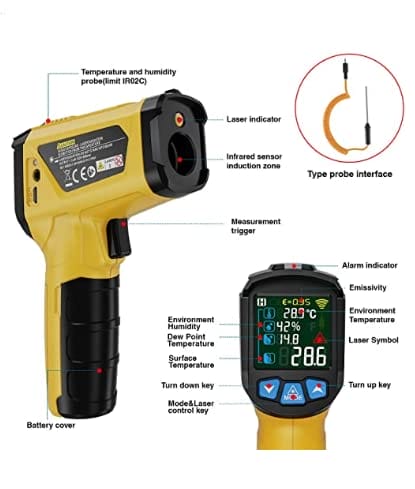 Termometr ten jest wyposażony w funkcję laserowego celownika, który umożliwia precyzyjne namierzenie miejsca pomiaru. Dzięki temu możesz szybko i dokładnie sprawdzić temperaturę różnych powierzchni, takich jak potrawy, napoje, powietrze czy nawet silniki samochodowe.