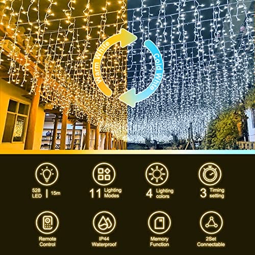 Lampki choinkowe LED do użytku wewnątrz i na zewnątrz, 528 diody LED, 15 m, 11 trybów świecenia, IP44, na imprezę, wesele, święta, miedziany przewód, z pilotem zdalnego sterowania, 3 timery (15 m)
