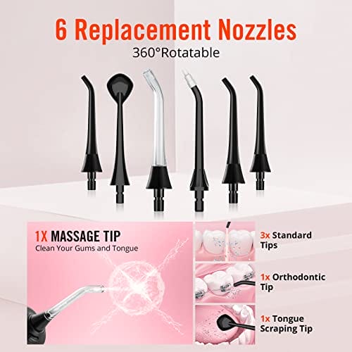 • 【6 Profesjonalnych Końcówek Zamiennych】- W zestawie z 6 SZTUK obracanych o 360 ° końcówek strumieniowych: 1x UNIKALNA końcówka do masażu, odpowiednia dla wrażliwych dziąseł, początkujących, dzieci i starszych; 3 standardowe końcówki do codziennego głębokiego czyszczenia zębów i nitkowania. 1x Końcówka ortodontyczna do czyszczenia nieregularnych zębów, aparatów ortodontycznych i implantów, 1x Końcówka do skrobania języka dla skutecznej powłoki czyszczącej, zapobiegająca nieświeżemu oddechowi.