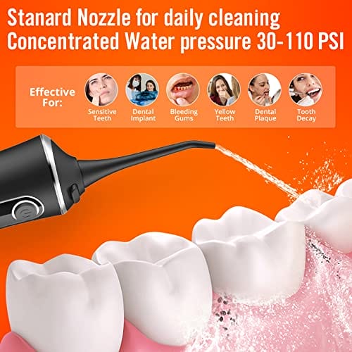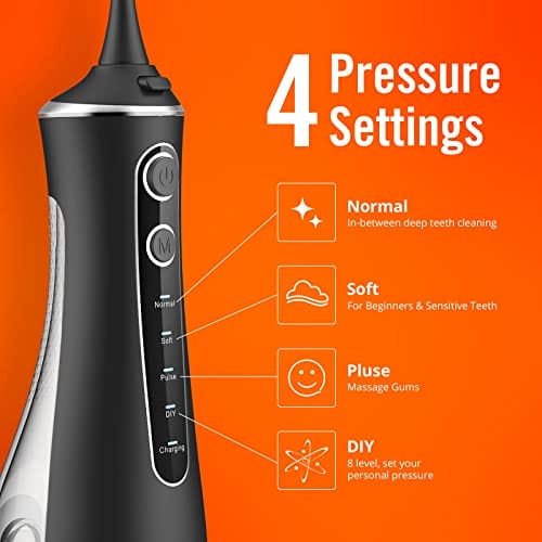 • 【4 Tryby Czyszczenia, Wydajne Czyszczenie zębów】- LF irygator wodny LF jest wyposażony w tryb normalny/miękki/pulsacyjny/zrób to sam, możesz ustawić żądane ciśnienie wody i cieszyć się wygodnym czyszczeniem zębów wodą. Puls wody waha się od 1400 razy/min do 1800 razy/min. Ciśnienie wody waha się od 30PSI do 110PSI. Irygator do zębów usuwa do 99,9 procent płytki nazębnej i jest do 50 procent skuteczniejszy niż nić dentystyczna w poprawie zdrowia dziąseł.