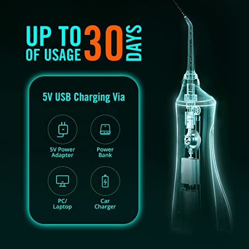 • 【Pamiętaj, aby ładować co 3 Tygodnie】- Elektryczny flosser zasilany bateryjnie obsługuje do 30 dni użytkowania po jednym pełnym naładowaniu, bezprzewodowy, ładowany przez USB ułatwia ładowanie za pomocą ładowarki do telefonu komórkowego, komputera/laptopa, power banku lub ładowarki samochodowej, nadaje się do użytku w domu, biurze, podróży służbowej lub podróży. Idealny prezent dla przyjaciół, kochanków, członków rodziny i współpracowników.