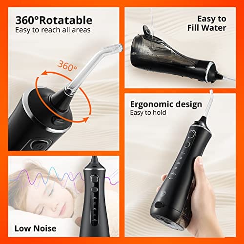 • 【Ergonomiczna Konstrukcja】- Irygator wodny zaprojektowany z małym i antypoślizgowym uchwytem, łatwy do trzymania; Końcówki obracające się o 360° mogą z łatwością czyścić trudno dostępne miejsca; Odłączany zbiornik na wodę o pojemności 220 ml z łatwym do napełniania otworem na wodę, bez konieczności zatrzymywania nici wodnej; Wodoodporność IPX7 pozwala na używanie irygatora doustnego podczas kąpieli pod prysznicem; Niski poziom hałasu zapewnia komfortowe poranne czyszczenie zębów!