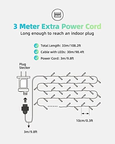 【Ciepła biel 300: 【Ciepła biel 300 LED】Długość całkowita 300 łańcuchów świetlnych LED: 33 m, kabel z diodami LED: 30 m, kabel sieciowy bez diod LED: 3 m, co jest wystarczająco długie, aby podłączyć kolejną wtyczkę. Idealne na choinkę, do sypialni, pokoju dziewczynki, ogrodu, na werandę, baby shower, imprezy lub wszys