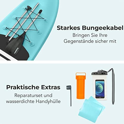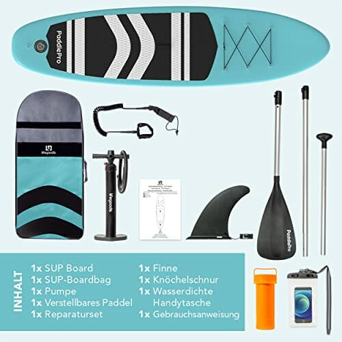 • ✅ ZESTAW ALL-IN-ONE – Deska do pływania na stojąco LifeGoods dostarczana jest ze wszystkimi akcesoriami, których potrzebujesz do rozpoczęcia przygody z paddleboardingiem. Obejmują one zdejmowany statecznik, pompkę ręczną, zestaw naprawczy, smycz na kostkę, torbę transportową, regulowane wiosło i wodoodporne etui na telefon.