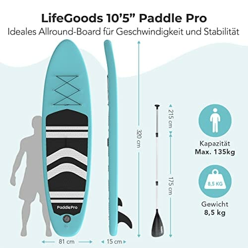 • ✅ IDEALNY STOSUNEK PRĘDKOŚCI DO STABILNOŚCI – Deska SUP LifeGoods z trzema płetwami posiada wymiary zalecane dla najlepszego połączenia prędkości i stabilności. Deska do pływania na stojąco zapewni wspaniały paddleboarding! Nie jest wymagane doświadczenie.