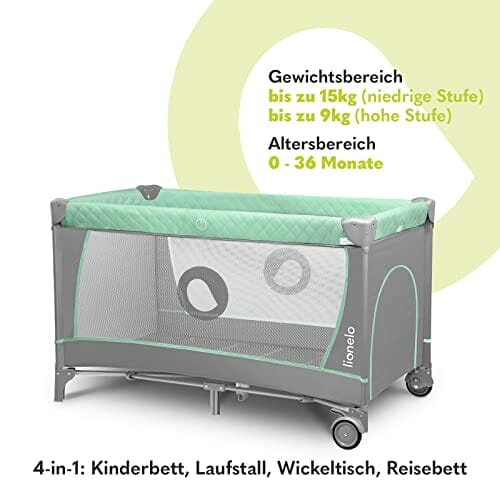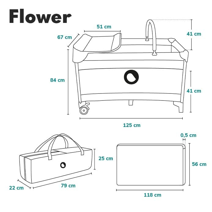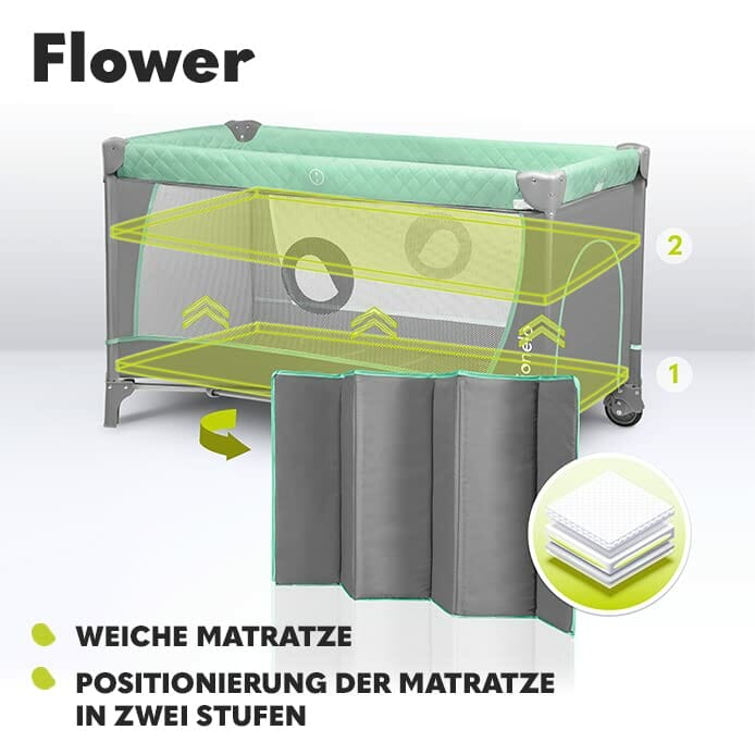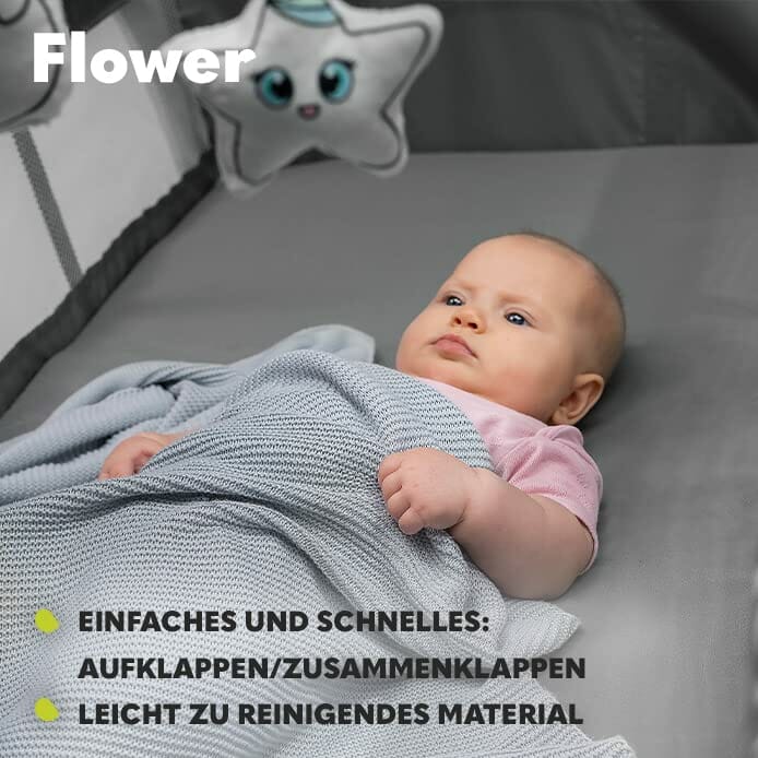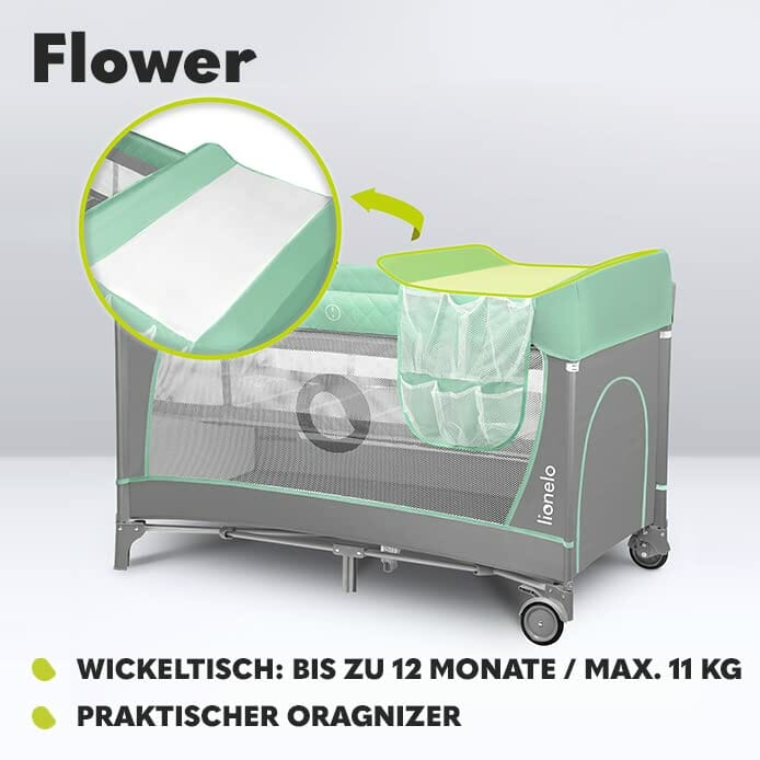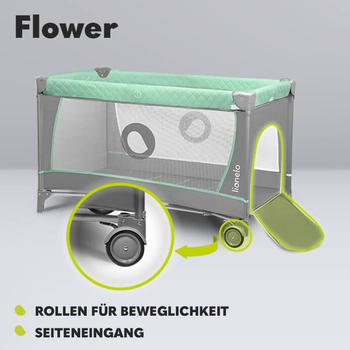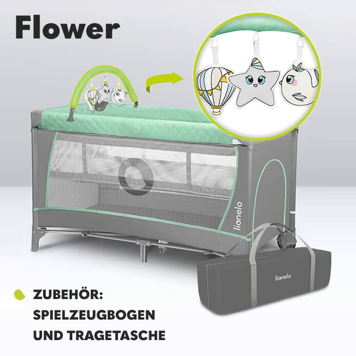 LIONELO Flower Łóżeczko Turystyczne Dla Niemowląt Z Wejściem Bocznym, Przewijak Dwie Wysokości Materaca, Łuk Zabawkowy Z Figurkami Do Zabawy, Kółka, Torba Do Noszenia