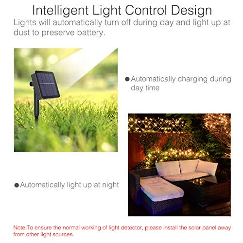 • 【8 trybów i bateria 800 mAh】 Wybierz preferowany efekt świetlny i stwórz romantyczną atmosferę. Dzięki dużej pojemności baterii, która zwiększa się do 800 MA, ta lampa solarna musi ładować tylko 6-8 godzin w ciągu dnia i może pracować 8-14 godzin w nocy.