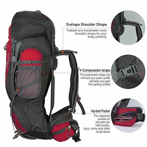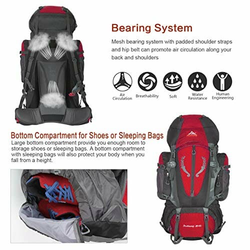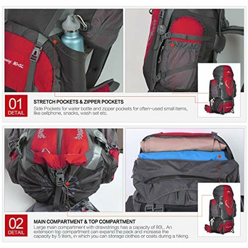 • Różne systemy zawieszenia i organizacji: Dzięki smyczom możesz powiesić kij do wspinaczki, namioty, składane krzesła i tak dalej. Pierścień wiszący na pasku może powiesić czajnik, latarkę, dolną komorę można nosić śpiwory lub buty. Górna komora może nosić ubrania. Obie strony są wyposażone w kieszeń o dużej pojemności (około 2 l), może pomieścić dużą liczbę trywialnych przedmiotów. Z kieszenią na zamek błyskawiczny na obu paskach biodrowych można włożyć do niego małe przedmioty, takie jak telefony komórkowe, latarki.