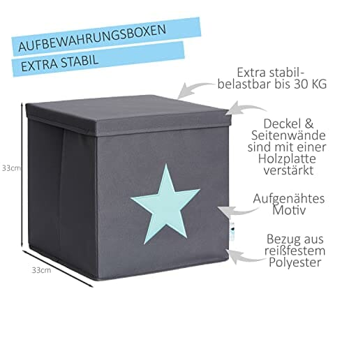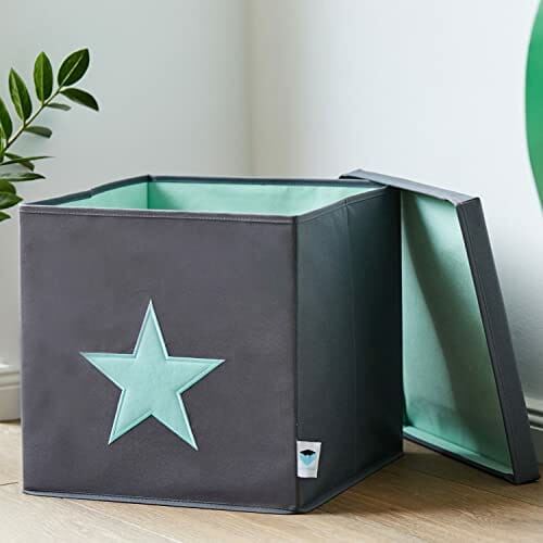 STORE.IT 672241 pudełko do przechowywania z pokrywką, szare z miętowo-zieloną gwiazdą, wzmocnione MDF, miętowy, 33 x 33 x 33 cm
