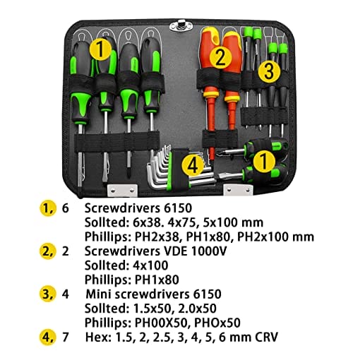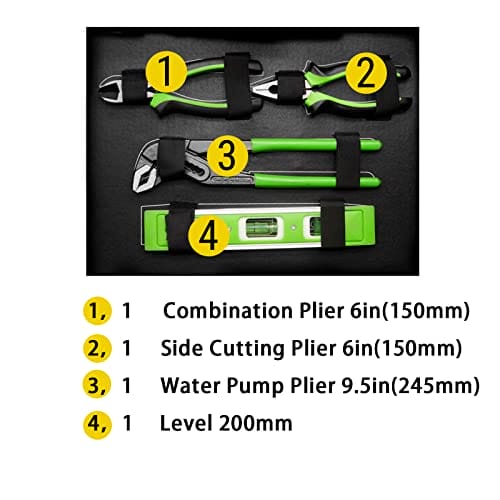 - 【Layer 1】:1 x Kombizange 6″(150mm),1 x Seitenschneider 6″(150mm),1 x Wasserpumpenzange 9.5″(245mm),1 x Wasserwaage 200mm.【Layer 2】: 1 x Verstellbarer Schraubenschlüssel 8″(200mm), 1 x Spitzzange 6″(150mm), 50 x Bits 6150,【Layer 3】: 6 x Schraubendreher 6150 : Sollted: 6×38, 4×75, 5×100 mm Phillips: PH2x38, PH1x80, PH2x100 mm, 4 x Mini-Schraubendreher 6150 : Sollted: 1.5×50, 2.0×50 Phillips: PH00X50, PH0x50, 2 x Schraubendreher VDE 1000V : Sollted: 4×100 Kreuzschlitz: PH1x80, 7 x Sechskant: 1,5, 2, 2,5, 3, 4, 5, 6 mm CRV