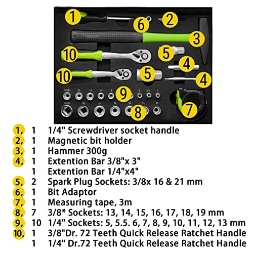 - 【Layer 4】: 7 x 3/8″ Steckschlüssel: 13, 14, 15, 16, 17, 18, 19 mm, 1 x Verlängerungsstange 3/8 „x 3″, 2 x Zündkerzensteckschlüssel: 3/8″ x 16 & 21 mm, 1 x 3/8″ Dr. 72 Zähne Schnellspanner-Ratschengriff, 10 x 1/4” Steckschlüssel: 5, 5.5, 6, 7, 8, 9, 10, 11, 12, 13 mm, 1 x Verlängerungsstange 1/4 „x 4″, 1 x 1/4″ Dr. 72 Zähne Schnellspanner-Ratschengriff, 1 x 1/4” Schraubendreher-Steckschlüsselgriff, 1 x Bit-Adapter, 1 x Magnetischer Bithalter, 1 x Hammer 300g, 1 x Maßband, 3m