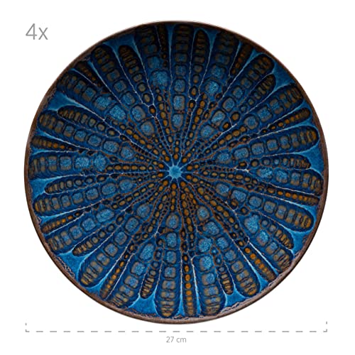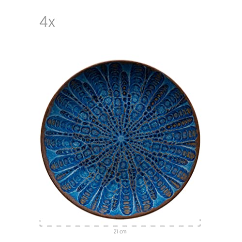 ✅ Serwis obiadowy z: Serwis obiadowy z kolekcji naczyń kamionkowych akwamaryn charakteryzuje się ciemnoniebieskimi kolorami, które przypadkowo przepływają po stylu vintage inspirowanym mauretańskim wzorem w naturalnym odcieniu brązu. Ta technika glazury sprawia, że każdy talerz ceramiczny w tym zestawie naczyń jest unik