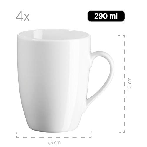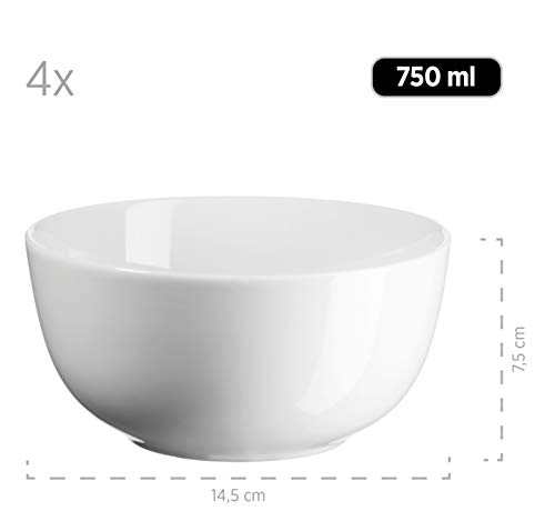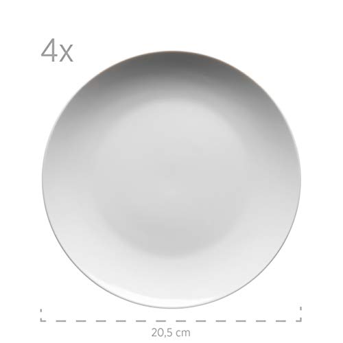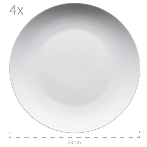 • 16-częściowy zestaw białych naczyń dla 4 osób z porcelany, składający się z 4 płaskich talerzy (Ø 24 cm), 4 miseczek na musli lub miseczek na zupę (Ø 14,5 cm, pojemność 750 ml), 4 talerzy deserowych (Ø 20,5 cm) i 4 filiżanek do kawy (290 ml)