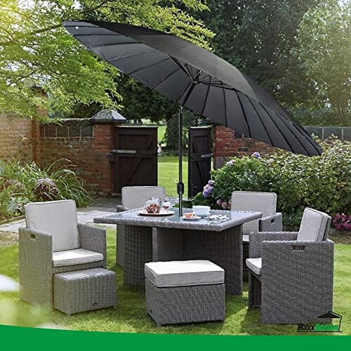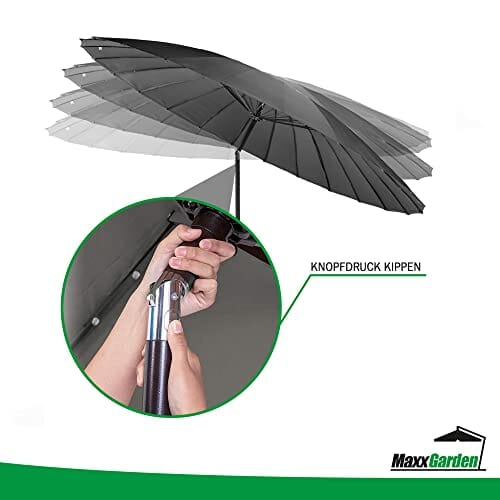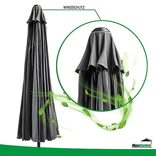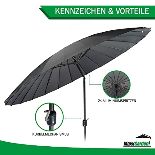 Einzelheiten: Design Shanghai Design: Das besondere Design dieses MaxxGarden Sonnenschirms zeichnet sich durch die Anzahl der Aluminiumstangen aus, aus denen das Gestell des Produkts besteht, in der Tat sind sie sehr zahlreich, um die Festigkeit und Spannung der Leinwand zu gewährleisten.
