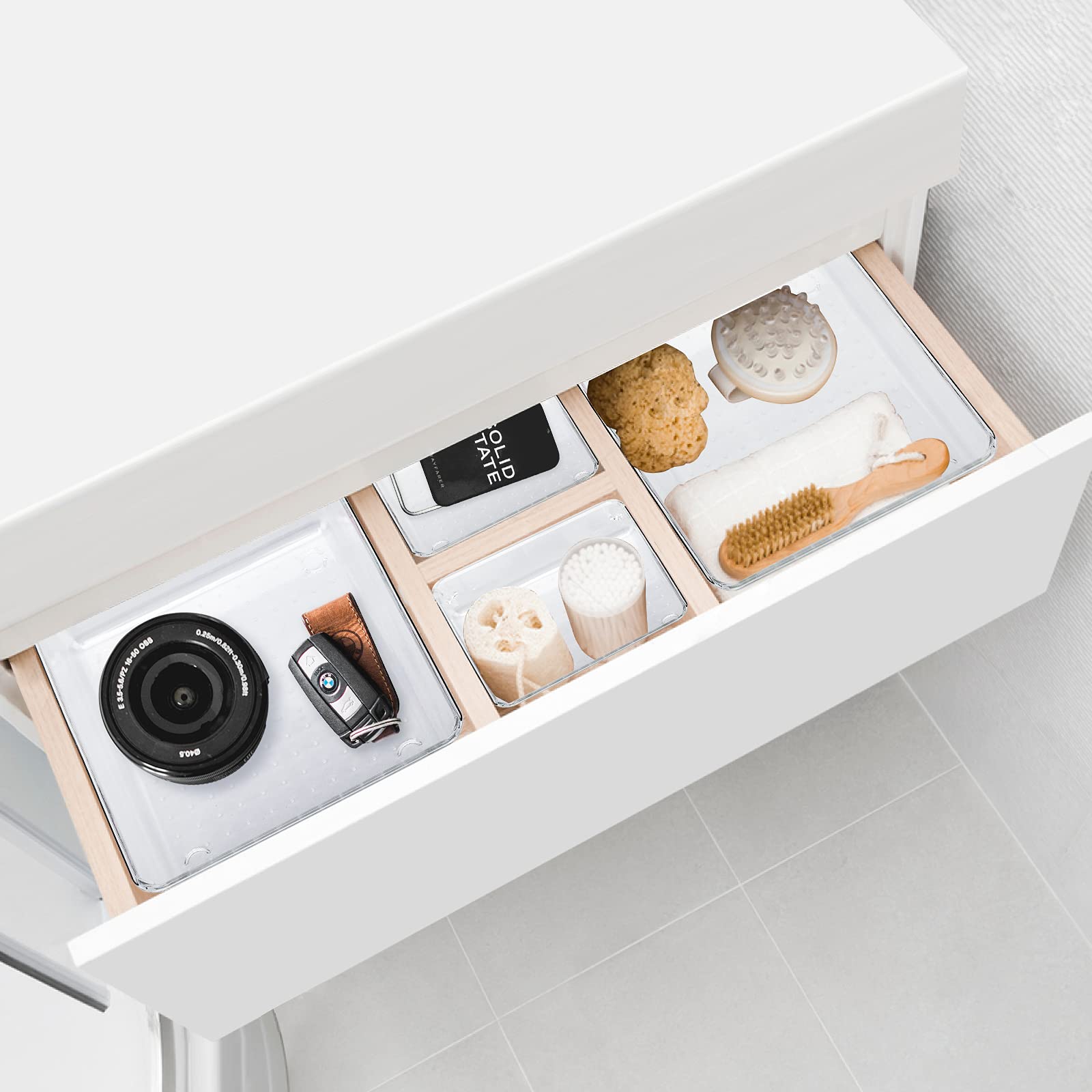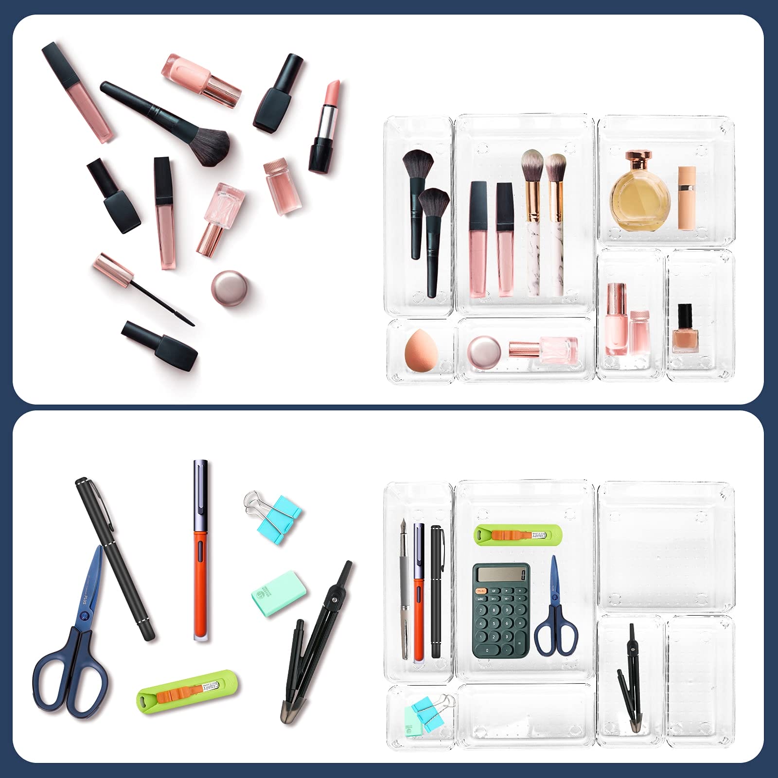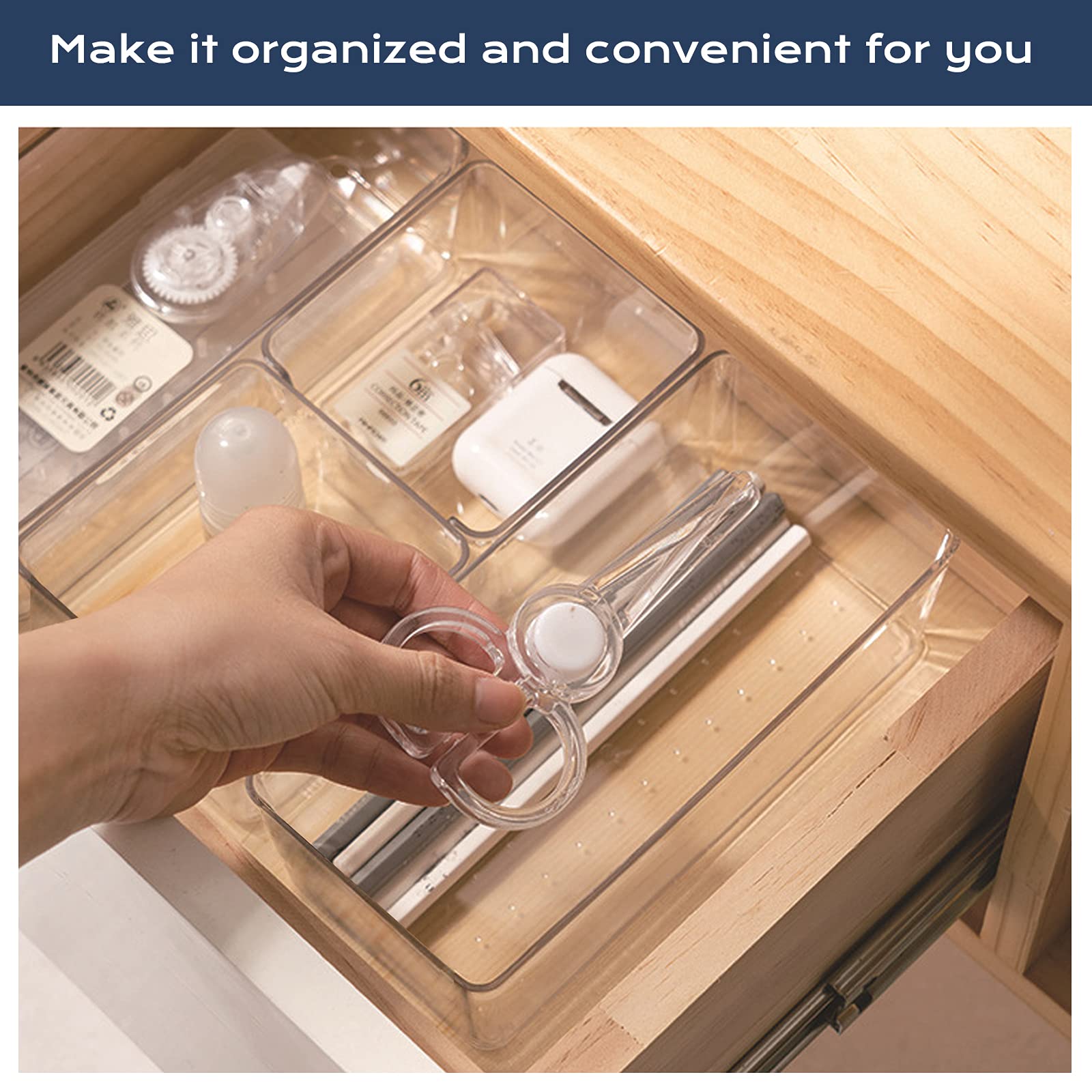 • Elastyczna struktura z możliwością układania w stos: Te systemy organizacji szuflad można układać w stos lub układać oddzielnie, aby rozłożyć lub oddzielić przedmioty w szufladach, aby utrzymać porządek w pomieszczeniu. Ponadto przejrzysta i przezroczysta struktura umożliwia szybką kontrolę Twoich artykułów.