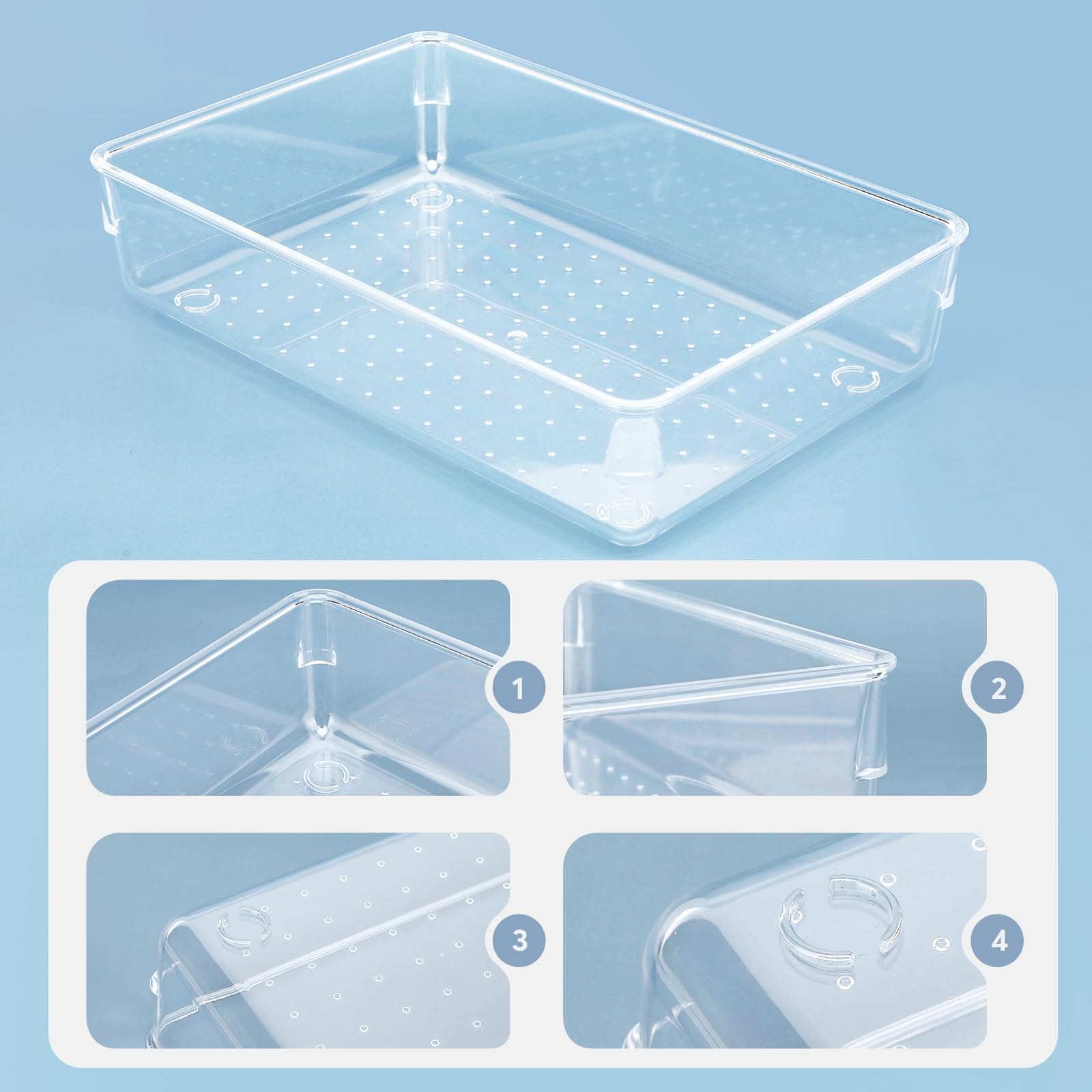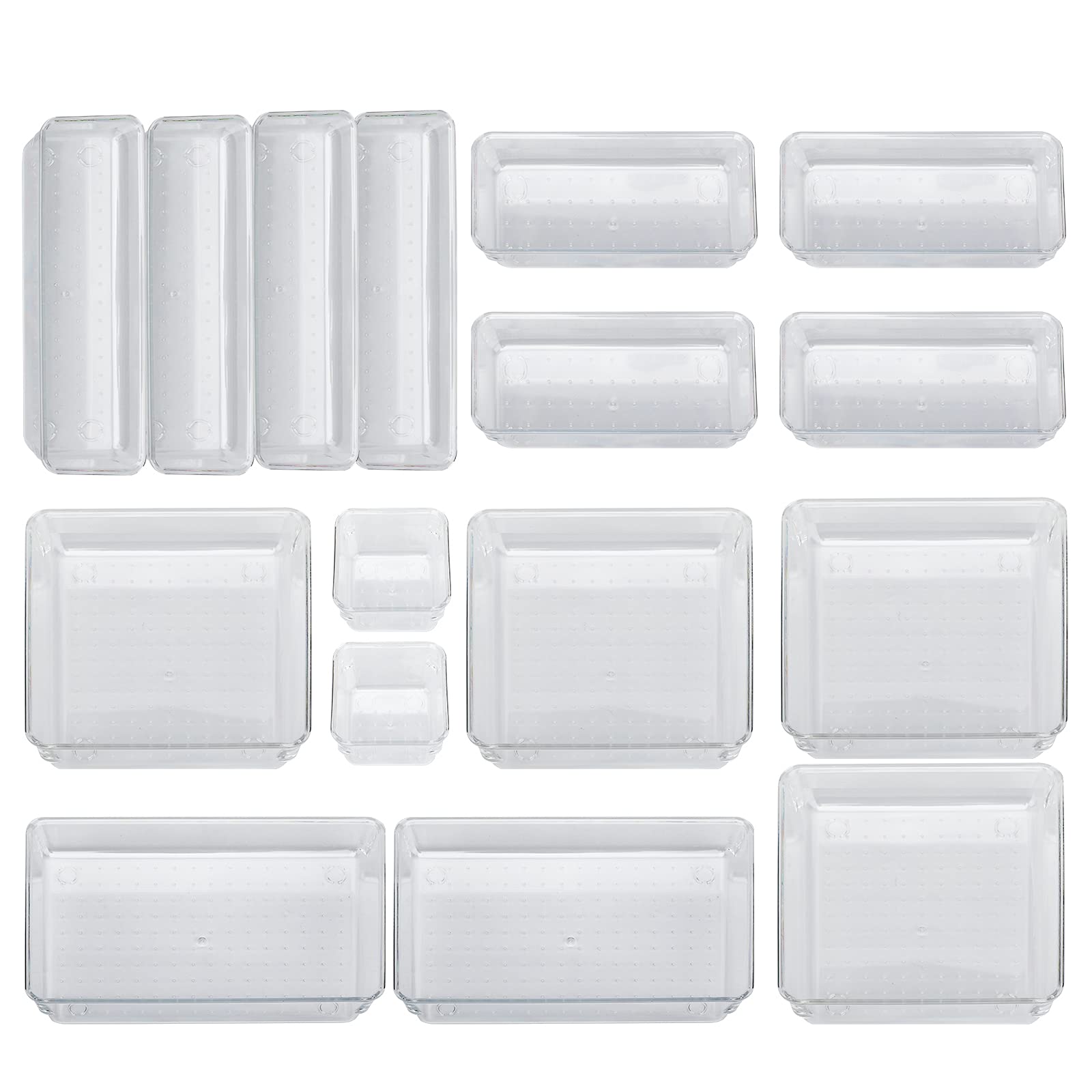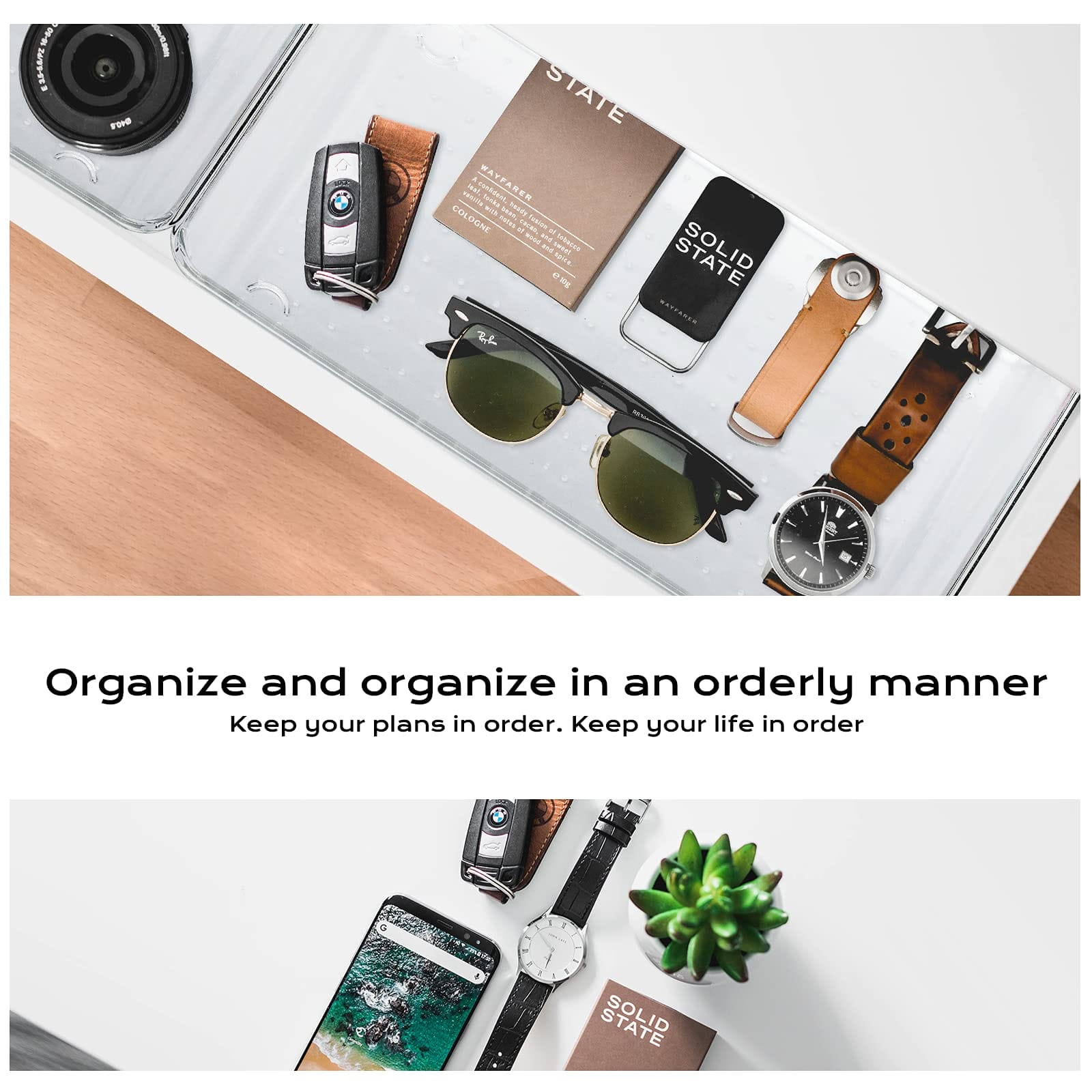 • Elastyczna struktura z możliwością układania w stos: Te systemy organizacji szuflad można układać w stos lub układać oddzielnie, aby rozłożyć lub oddzielić przedmioty w szufladach, aby utrzymać porządek w pomieszczeniu. Ponadto przejrzysta i przezroczysta struktura umożliwia szybką kontrolę Twoich artykułów.