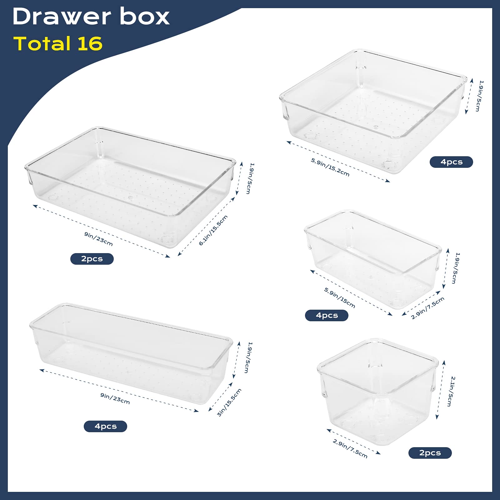 • Kilka rozmiarów: 16 sztuk, 5 rozmiarów i uporządkuj szuflady zgodnie z własnymi potrzebami i rozmiarem szuflady. (15,5 x 15,5 x 5 cm) x 4, (23 x 15,5 x 5 cm) x 2, (25 x 8,2 x 5 cm) x 4, (15 x 7,5 x 5 cm) x 4, (7,5 x 7,5 cala x 5 cm) x 2