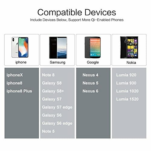 • Uniwersalna ładowarka: ta bezprzewodowa ładowarka do iPhone i Samsung jest kompatybilna z iPhone 8/X/8Plus, Note8/S8Plus/S7, S6/S6 Edge, Note 5, Nexus 4/5/6, Lumia 920/930/1020/1520 (testowana smartfony) i wszystkimi telefonami z funkcją indukcyjną.