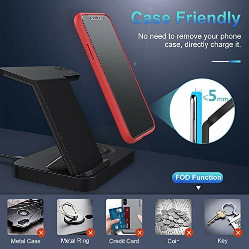• 【Szeroka kompatybilność】: Obszar ładowania telefonu: Obsługuje tryb szybkiego ładowania 10 W (dla Galaxy S20/S20+/S2O Ultra/S10+/S9/S9+/S8/S8+/S7/S7 edge/S6 edge+/Note 10/9/8/8 ); 7,5 Tryb W (dla iPhone’a 11/11 Pro/11 Pro Max/XR/XS/XS Max/X/8/8 Plus); Tymczasem odpowiedni obszar nadajnika oferuje wyjście do 5 W dla Airpods Pro, etui bezprzewodowe AirPods 2 (model 2019) i Galaxy Buds. /Galaxy Budd s +; Obszar ładowania zegarka: Tylko dla Apple Watch Series 1/2/3/4/5 (38 mm, 40 mm, 42 mm, 44 mm).