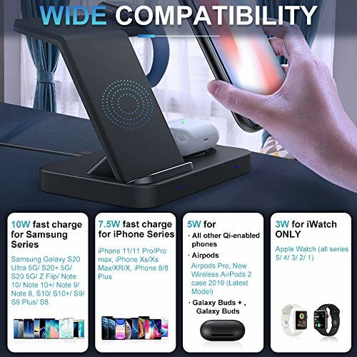 MoKo Bezprzewodowy stojak do ładowarki, stacja dokująca 3 w 1 Qi 10 W z potrójnymi punktami kompatybilny z iPhone 12/12Pro/max/12 Mini/Airpods 2/Pro, Galaxy Buds/20 Plus/S20 (z adapterem QC)