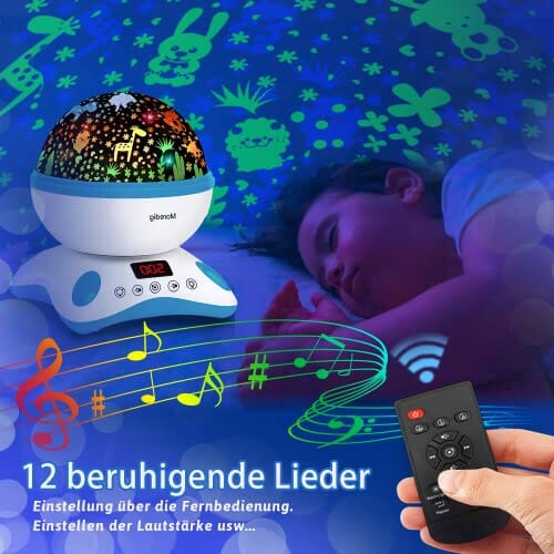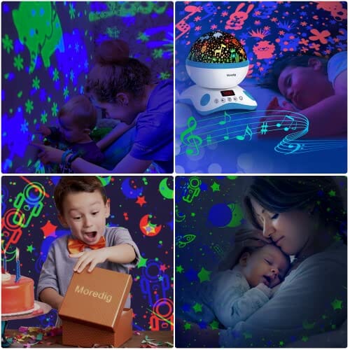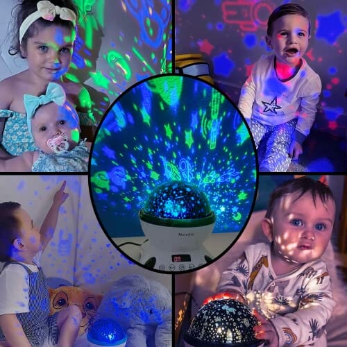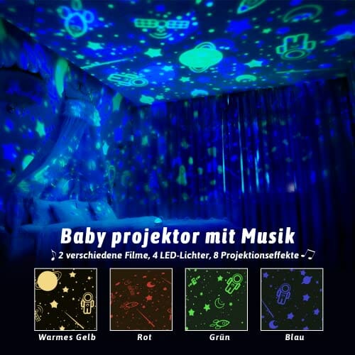 • Projekcja gwiazd / świata zwierząt + 8 trybów świecenia: ① Projektor wyświetlający gwiaździstą noc: romantyczna gwiazda i astronauci, orbita, rakieta, radar i UFO, pokryją cały sufit. ② Światło nocne z projekcją świata zwierząt: projekcja słonia, lisa, królika, pawia, lwa, zebry i niektórych kwiatów i traw na ścianie. ③ Tryb kolorowych świateł: posiada 8 trybów światła w połączeniu z czerwonym, zielonym, niebieskim i ciepłym białym kolorem, możesz je zmieniać zgodnie z własnymi preferencjami. ④ Tryb lampki nocnej: Po usunięciu dwóch czarnych folii.