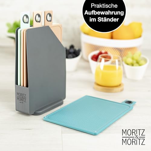Moritz & Moritz 4 x deska śniadaniowa, nadaje się do mycia w zmywarce, 20,5 x 14,5 cm – deska do krojenia z tworzywa sztucznego, mała w praktycznym stojaku