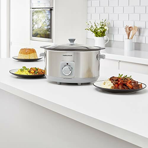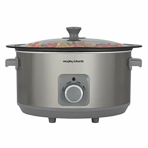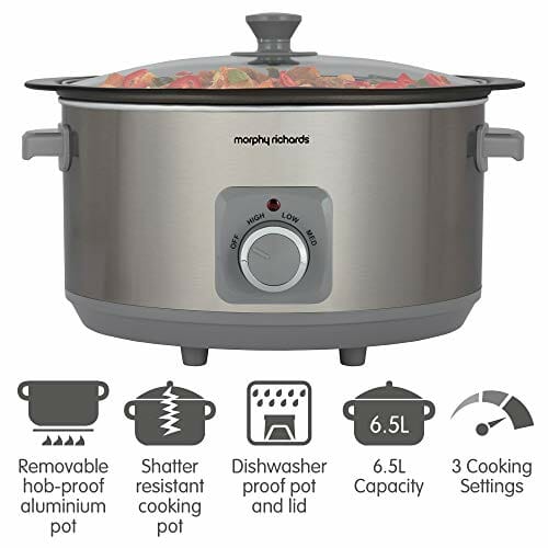 Einzelheiten: 461014 Morphy Richards Braten & Schmoren 6,5 l Aluminium Schongarer, Schongaren gehört zu den gesündesten und kosteneffektivsten Kochmethoden. Mit dem Morphy Richards Braten & Schmoren 6,5 l Aluminium Schongarer servieren Sie mit Leichtigkeit 10-12 Vorspeisen oder 6-8 Hauptgerichte, was ihn ideal für die Zubereitung von Familiengerichten macht. Der ovale 6,5 l Aluminiumtopf eignet sich ideal für Fleischgerichte sowie für Aufläufe, Currys und Chilis – perfekt für die Familie und zur Bewirtung von Gästen. Mit dem einfach zu bedienenden Drehregler können Sie Ihre Einstellung wählen: Low (Niedrig: 6-12 Stunden), Medium (Mittel: 4-10 Stunden) oder High (Hoch: 3-8 Stunden). Dies garantiert, dass Ihre Mahlzeit zu der von Ihnen gewünschten Zeit fertig ist. In der Bedienungsanleitung des Produkts finden Sie eine Vielzahl von Rezepten zum Ausprobieren. Dank des Deckels aus gehärtetem Glas können Sie den Garvorgang beobachten, ohne Hitze entweichen zu lassen, und der herausnehmbare Aluminiumtopf dient perfekt als Servierschüssel. Nach dem Gebrauch kann der Aluminiumtopf einfach in der Spülmaschine gereinigt werden. Weitere Merkmale sind: Cool-Touch Griffe und rutschfeste Füße.