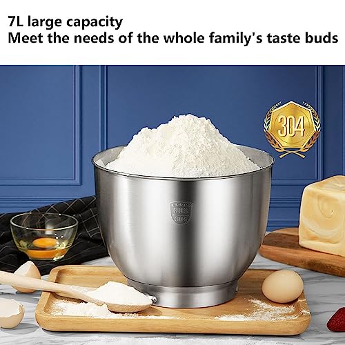 • * Duża pojemność 7L: Miska z robotem do pieczenia o pojemności 7 litrów wykonana jest ze stali nierdzewnej z ergonomicznym uchwytem. Przeznaczony jest do pracy z maksymalną pojemnością ciasta 1,5 kg mąki, aby pomieścić 17 jaj, aby zrobić 3 kg ciasta na ciastka… Hak do ciasta zapewnia równomierne wymieszanie ciasta, trzepaczka jest idealna do ciasta chlebowego i mieszania potraw, bicz jest dobry do jaj, kremów, musów itp.