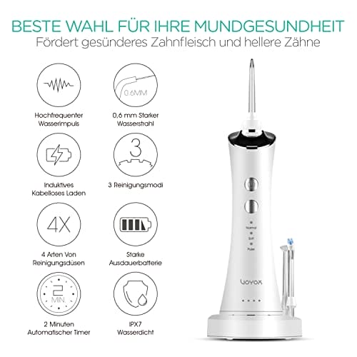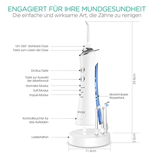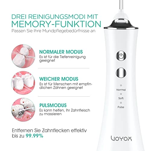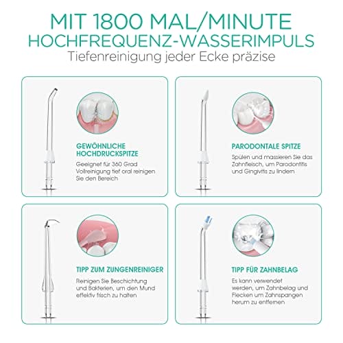 • 3 TRYBY I 4 Dysze – Łatwe przełączanie różnych trybów. Można dowolnie przełączać się między trzema trybami. (normalne, miękkie i pulsujące). A cztery dysze mogą zaspokoić różne potrzeby zębów. Zastosuj do chorób jamy ustnej, takich jak zmniejszenie tworzenia się płytki nazębnej, codzienna pielęgnacja jamy ustnej i czyszczenie jamy ustnej.