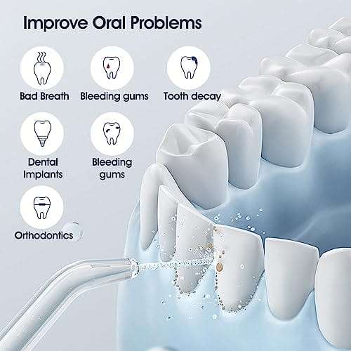 • 【Głębokie czyszczenie】 Wydajny irygator do jamy ustnej o częstotliwości natrysku do 1000 razy na minutę, który jest o 60% skuteczniejszy niż tradycyjna nić dentystyczna. Może skutecznie usuwać resztki jedzenia ukryte głęboko między zębami. Jest bardzo odpowiedni dla osób z implantami dentystycznymi, aparatami ortodontycznymi, koronami, mostami i zapaleniem dziąseł.