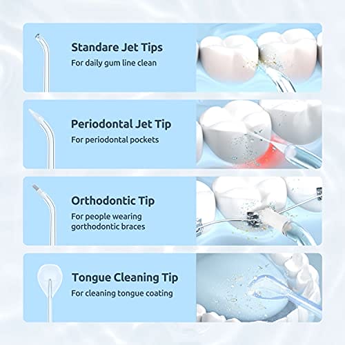 • [3 tryby czyszczenia i wodoodporna konstrukcja IPX7]: irygator do wody ma miękkie, pulsacyjne, mocne tryby do wyboru dzięki konstrukcji o niskim poziomie hałasu, która może zaspokoić różne potrzeby w zakresie pielęgnacji jamy ustnej. Wodoodporność IPX7 zapewnia, że ​​produkt jest bezpieczny w użyciu i zapobiega wyciekom.