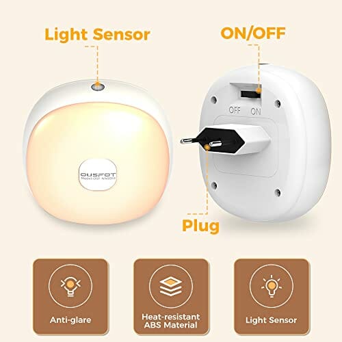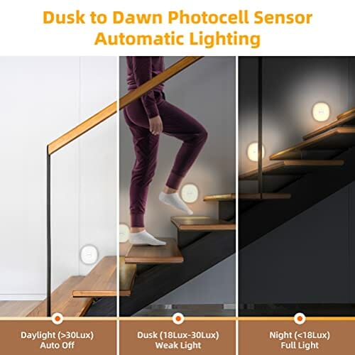 • Automatyczny czujnik zmierzchu: dzięki wbudowanemu inteligentnemu czujnikowi zmierzchu lampka nocna włączy się automatycznie o zmierzchu i w nocy lub przy niewystarczającym oświetleniu otoczenia (oświetlenie <18lux) i wyłączy się automatycznie o świcie (oświetlenie >30lux).