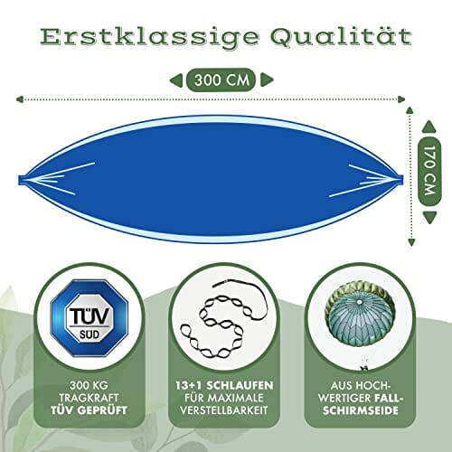 • Ö – mit den Maßen 300 x 170 cm ist die Naturbummler Reisehängematte besonders groß und eignet sich daher ideal auch um zu zweit entspannte Stunden im Freien zu verbringen