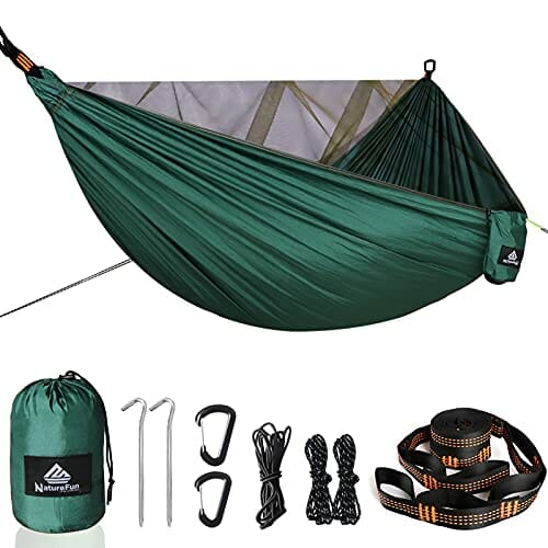 NatureFun Ultralekki hamak kempingowy z siatką, udźwig 300 kg, (290 x 140 cm), oddychający, 4 x karabińczyk premium, 3 x nylonowe pętelki, 2 linki napinające, 2 szlifowane gwoździe