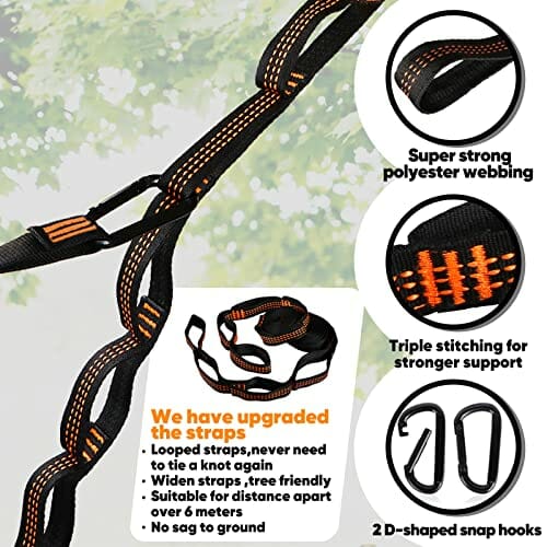 • ► Mocne – specjalnie zaprojektowane, bardzo mocne nylonowe pasy końcowe, są wystarczająco mocne. Dzięki naszemu unikalnemu wzornictwu pasów ma dwukrotnie większą odporność na pęknięcia niż większość konkurencji. Nylonowa tkanina spadochronowa 210T w jakości wojskowej zapewnia zarówno wytrzymałe, jak i wygodne łóżko i jest luksusowo wymiarowane, 290 x 140 cm. Więcej miejsca w tym hamaku kempingowym. może wytrzymać do 300 kg.