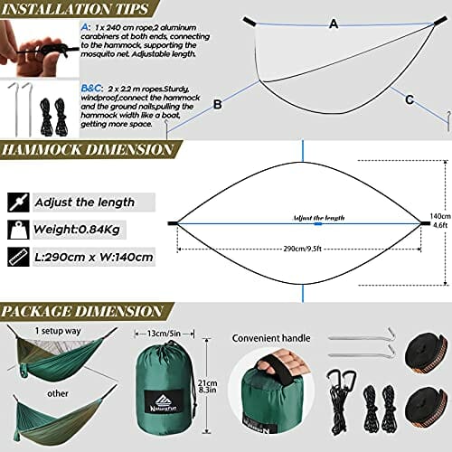 • ►Super lekki, kompaktowy – materiałowy worek jest wygodnie wszyty w hamak, dzięki czemu nie zgubisz go. Można ją spakować do rozmiaru siatkówki i waży tylko około 840 g (zawiera wszystkie akcesoria pokazane na zdjęciach). Lekki i wystarczająco mały, aby zabrać go ze sobą podczas każdej aktywności na świeżym powietrzu. Wyprodukowano z bardzo mocnego nylonowego parasola z potrójnymi szwami. Oddychająca, szybkoschnąca i odporna na gnicie i pleśń.