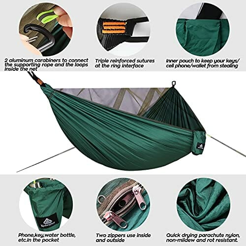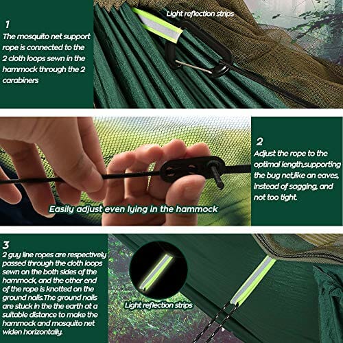• ► Wytrzymała siatka sznurkowa – zapobiega zakłóceniom spokoju nawet najmniejszych szkodników. Wysokiej jakości podwójny zamek błyskawiczny, otwierany od wewnątrz lub na zewnątrz. Siatka przeciw owadom zawiera 2100 otworów na cal kwadratowy, dzięki czemu chroni przed owadami lub najdrobniejszymi pchłami. Możesz po prostu obrócić hamak i jak normalne zawieszenie