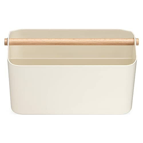 Navaris Organizer z tworzywa sztucznego, pojemnik na przybory z drewnianym uchwytem i 2 przegródkami, pojemnik do przechowywania do łazienki, sypialni, kuchni, kremowy, rozmiar średni
