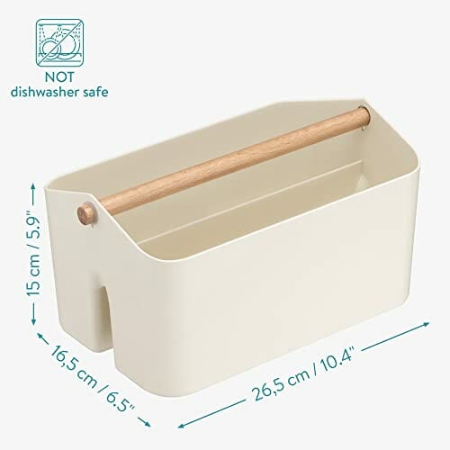 ✅ Kosz ma wymiary: Kosz ma wymiary 26,5 x 16,5 x 15 cm i waży 360 g. Wykonany jest z polipropylenu (PP) z uchwytem z drewna bukowego. Organizer nie nadaje się do mycia w zmywarce.