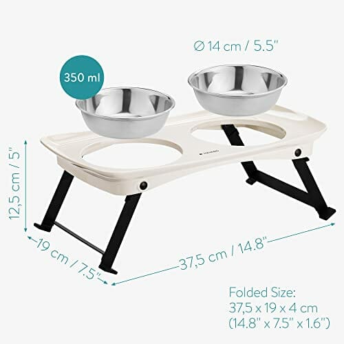 • Szczegóły: 1 x uchwyt na miskę, 2 x miska/rozmiar patery: 37,5 x 19 x 4 cm, po rozłożeniu: 37,5 x 19 x 12,5 cm / miska: 14 x 4 cm, 350 ml pojemność / waga: 695 g / materiał: żywica syntetyczna, stal nierdzewna