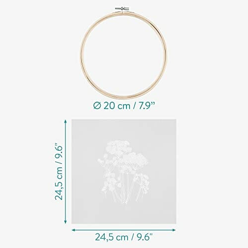Szczegóły: 3 x: Szczegóły: 3 x zestaw do haftowania z 1 x bambusową ramką, 1 x klipsem, 1 x ściereczka do haftowania w kolorze przezroczystym, 3 x kolorowa przędza, 1 x igła, 1 x instrukcja obsługi w różnych językach / rozmiar: ramka: ø 20 cm, tkanina: 24,5 x 24,5 cm / waga: 210 g