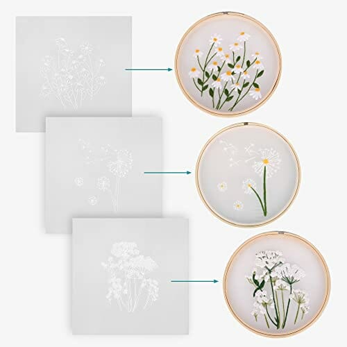 Navaris Przędza w kwiaty „zrób to sam” zestaw do haftowania – 3 x zestaw do haftowania dla początkujących – ramka do haftowania z przezroczystym wzore