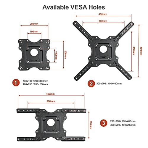 • Zgodny ze standardem VESA: 100 × 100 mm, 200 × 100 mm, 200 × 200 mm, 200 × 300 mm, 200 × 400 mm, 300 × 200 mm, 300 × 300 mm, 400 × 200 mm, 400 × 400 mm (standard VESA: światowy standard montażu: Telewizory plazmowe / LCD / LED, wskazujące w mm poziome i pionowe odstępy między otworami montażowymi) Przed zakupem tego produktu należy sprawdzić rozmiar, wagę i VESA swojego telewizora.