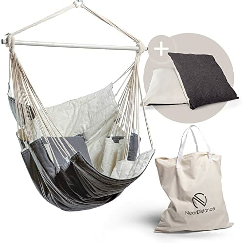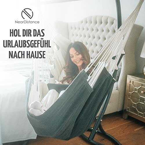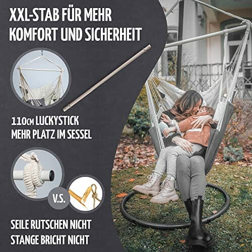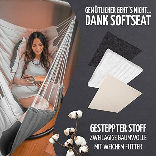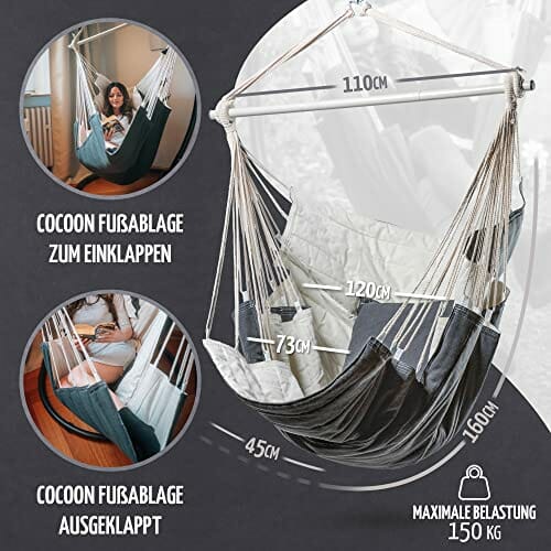 • Nasz hamak do siedzenia jest idealnym rozwiązaniem dla zachowania pysznego napoju w słońcu. Dzięki dużej przegródce na książki i praktycznemu uchwytowi na napoje masz wszystko, czego potrzebujesz. Dwie duże poduszki zapewniają, że materiał optymalnie dopasowuje się do ciała i w ten sposób szczególnie odprężysz się z obciążonymi plecami. Dzięki temu masz wspaniałe miejsce do odosobnienia.