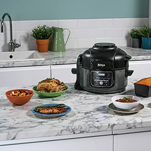 Einzelheiten: Der Ninja Foodi MINI Multikocher passt perfekt in jede Küche. Er verfügt über 6 Garfunktionen und die exklusive TenderCrisp-Technologie von Ninja. Zaubern Sie schnell und einfach köstliche Eintopfgerichte, Beilagen und Desserts – von Brathähnchen und Gemüse über Nudelgerichte bis hin zu frisch gebackenem Brot und Kuchen. Selbst ein ganzes, 1,5 kg Brathähnchen ist kein Problem. Perfekt für bis zu zwei Personen. Die exklusive TenderCrisp-Technologie von Ninja gart zarte, saftige Mahlzeiten durch Druckgaren bis zu 70 % schneller als herkömmliche Garmethoden* (*Verglichen mit Slow Cook, Kochen oder Schmoren). Wählen Sie anschließend aus den Einstellungen Air Crisp oder Backen/Braten, um Ihren perfekt gekochten Gerichten ein knusprig goldenes Finish zu verleihen. Genießen Sie gebratene Hähnchenbrüste, goldgelbe Pommes frites, saftige Steaks, fluffige Frittatas, knusprig überbackene Nudelgerichte und mehr. Über das Ventil am Deckel können Sie ganz einfach zwischen Dampfgaren und Überbacken-Funktion wählen – für perfekte Ergebnisse bei jedem Gericht. Werden Sie kreativ – mit 6 Garfunktionen in einem Topf. HEISSLUFT-FRITTIEREN – Frittierte Gerichte mit gutem Gewissen genießen. Bis zu 75 % weniger Fett als bei herkömmlichen Frittiermethoden** (**Getestet im Vergleich zu herkömmlich frittierten, handgeschnittenen Pommes frites). Genießen Sie Süßkartoffelpommes, knusprige Fischstäbchen, Chicken Wings und vieles mehr – mit wenig bis gar keinem Öl. DRUCKGAREN – Superheißer Dampf gart Ihre Speisen schnell mit saftigen, zarten Ergebnissen, von Nudelgerichten und Chili bis hin zu Hähnchenbrust und anderem Fleisch. SLOW COOK – Von herzhaften Aufläufen bis hin zu pikanten Risottos: Stellen Sie sicher, dass Ihre Mahlzeit fertig ist, wenn Sie nach Hause kommen, indem Sie sie bis zu 8 Stunden im Voraus zubereiten. DÄMPFEN – Verwenden Sie die Funktion Dämpfen, um zarten Wolfsbarsch, perfekt gekochten Reis, gesundes Gemüse und mehr zu genießen. BACKEN/BRATEN – Bereiten Sie knusprige Bratkartoffeln mit einem köstlichen goldbraunen Finish, zarten Fisch und gebratenes Gemüse zu; backen Sie frisches Brot, Torten, Kuchen und Desserts. ANBRATEN/SAUTIEREN Verwenden Sie Anbraten/Sautieren zum Vorbereiten Ihrer Lieblingssteaks vor dem Garen, zum Karamellisieren von Zwiebeln, zum Rösten von Samenkörnern und zur Zubereitung von Soßengrundlagen direkt im Kochtopf. Garen Sie Tiefkühlgerichte und geben Sie ihnen zugleich ein knuspriges Finish, damit Ihr Abendessen im Handumdrehen fertig ist – kein vorheriges Auftauen erforderlich. Ist Ihr Abendessen fertig, bevor Sie es sind? Der Warmhaltemodus hält Speisen bis zu 12 Stunden nach dem Garen verzehrfertig. Keramikbeschichtete, antihaftende, spülmaschinenfeste Teile machen das Spülen leicht. Inspirierende Ideen finden Sie im mitgelieferten Rezeptbuch.