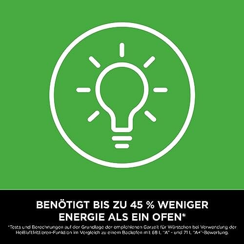 - BENÖTIGT BIS ZU 45 % WENIGER ENERGIE ALS EIN OFEN: Tests und Berechnungen auf der Grundlage der empfohlenen Garzeit für Würstchen bei Verwendung der Heißluftfrittieren-Funktion im Vergleich zu einem Backofen mit 68 L, A – und 71 L, A+, -Bewertung