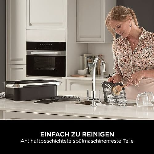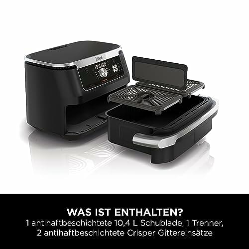 - WAS IST ENTHALTEN?: Hauptgerät, 1 antihaftbeschichtete spülmaschinenfeste 10,4 L Schublade, Silikon-Trenner, antihaftbeschichtete Crisper Gittereinsätze, Rezeptheft; gewicht: 11,9 kg; farbe: Schwarz