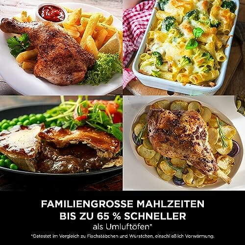 - 7 ZUBEREITUNGSFUNKTIONEN: Max Crisp, Heißluft-Frittieren, Braten, Backen, Aufwärmen, Dörren, Garen; bis zu 65 Prozent schneller als Umluftöfen, Getestet im Vergleich zu Fischstäbchen und Würstchen, einschließlich Vorwärmung